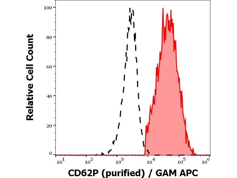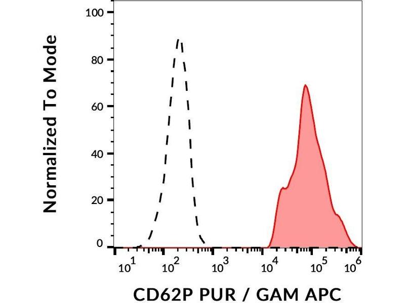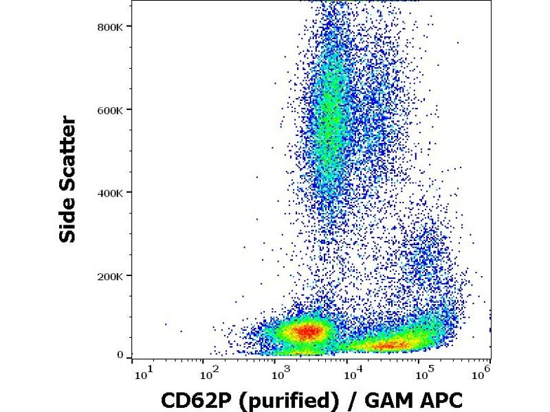 The antibody AK4 recognizes an extracellular epitope of CD62P (P-selectin), a 140 kD single chain type I transmembrane glycoprotein present in secretory alpha-granules in platelets, in Weibel-Palade bodies in endothelial cells and in megakaryocytes, it is relocated to the plasma membrane upon activation.