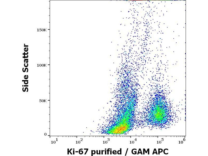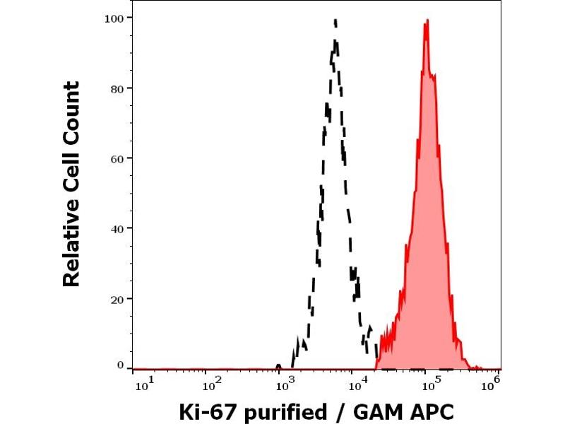Marker of proliferation Ki-67,Ki-67 is a highly protease-sensitive nuclear protein expressed in two isoforms (345 kDa and 395 kDa), both of which are identified by the antibody clone Ki-67. The Ki-67 antigen is essential for cell proliferation and its expression is restricted to the cycling cells. It is detected in G1, S, G2 and M phase, whereas it is absent in cells which are in G0 phase and it is not associated with DNA repair processes. Ki-67 thus represents an important tool for detection of proliferating cells, which is of great importance in tumor diagnostics and is commonly used as a prognostic factor in cancer studies.,KIA, MIB, Marker of proliferation Ki67, MKI67