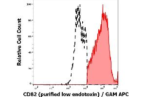 CD82 Molecule,CD82 (KAI1), a member of the tetraspanin family, forms complexes with other tetraspanin proteins, integrins, coreceptors, MHC class I and II molecules. These complexes influence adhesion, morphology, activation, proliferation and differentiation of B, T and other cells. CD82 regulates cytoskeleton rearrangement and may participate in the turnover of the tetraspanin complex members. Besides in the plasma membrane, CD82 is localized also in endosome/lysosome compartments. Tumour-suppressive roles of CD82 have been demonstrated.,R2, 4F9, C33, IA4, ST6, GR15, KAI1, SAR2, TSPAN27
