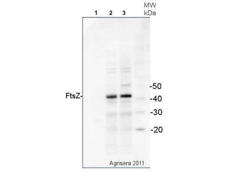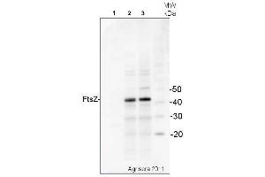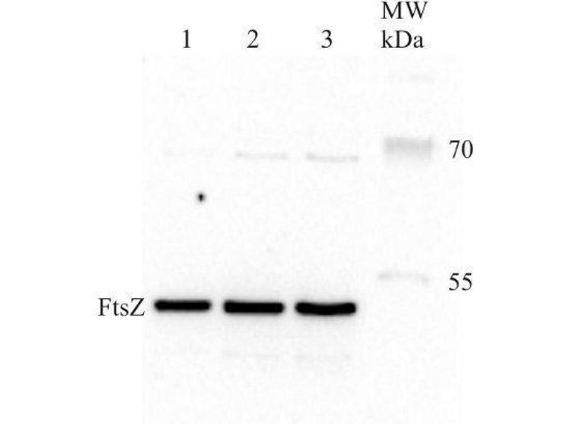 Expected / apparent Molecular Weight of the Antigene: 40 / 42 kDa FtsZ (cell division GTPase) is a well characterized protein of the bacterial cell division apparatus. This protein accumulates early in dividing cells, and has a crucial role during septum formation in most bacteria. It has also been accepted as the bacterial cytoskeletal counterpart to eukaryotic microtubules. Synonymes: sifB, SulB.