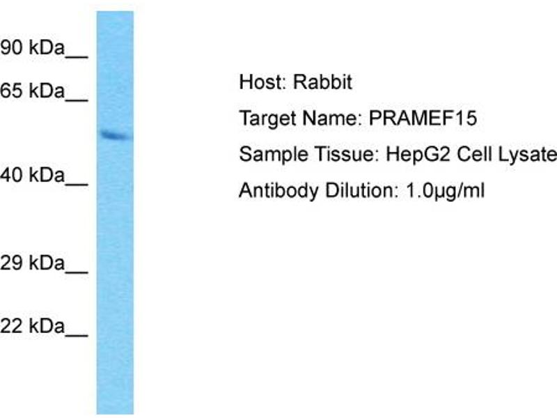 The Rabbit Polyclonal anti-PRAMEF15 antibody has been validated for WB. It is suitable to detect PRAMEF15 in samples from Human.