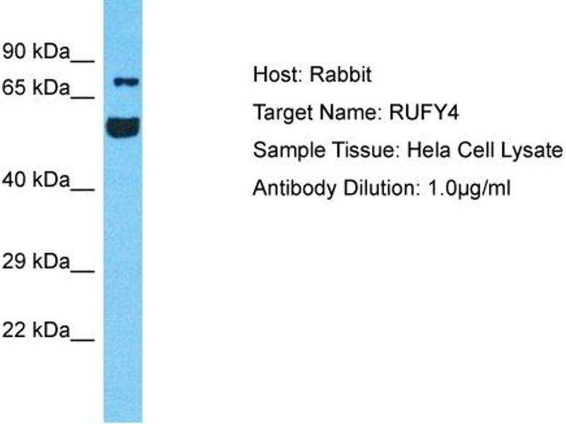 This is a rabbit polyclonal antibody against RUFY4. It was validated on Western Blot.