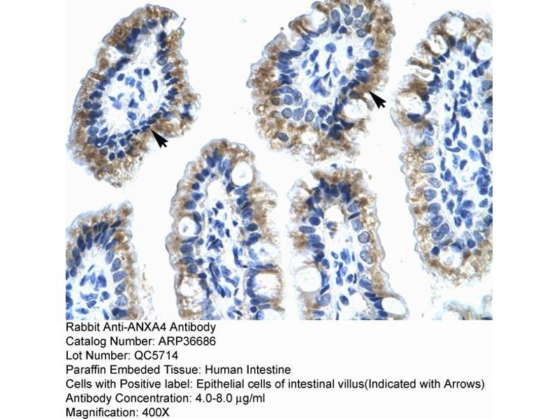 Annexin A4 (ANXA4) belongs to the annexin family of calcium-dependent phospholipid binding proteins. Although their functions are still not clearly defined, several members of the annexin family have been implicated in membrane-related events along exocytotic and endocytotic pathways. ANXA4 has 45 to 59 % identity with other members of its family and shares a similar size and exon-intron organization. Isolated from human placenta, ANXA4 encodes a protein that has possible interactions with ATP, and has in vitro anticoagulant activity and also inhibits phospholipase A2 activity. ANXA4 is almost exclusively expressed in epithelial cells.
