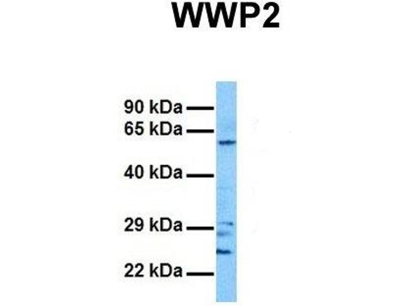WWP2 is a member of the NEDD4-like protein family. The family of proteins is known to possess ubiquitin-protein ligase activity. WWP2 contains 4 tandem WW domains. The WW domain is a protein motif consisting of 35 to 40 amino acids and is characterized by 4 conserved aromatic residues. The WW domain may mediate specific protein-protein interactions.This gene encodes a member of the NEDD4-like protein family. The family of proteins is known to possess ubiquitin-protein ligase activity. The encoded protein contains 4 tandem WW domains. The WW domain is a protein motif consisting of 35 to 40 amino acids and is characterized by 4 conserved aromatic residues. The WW domain may mediate specific protein-protein interactions. Three alternatively spliced transcript variants encoding distinct isoforms have been found for this gene.