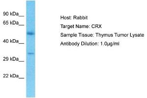 The protein encoded by this gene is a photoreceptor-specific transcription factor which plays a role in the differentiation of photoreceptor cells. This homeodomain protein is necessary for the maintenance of normal cone and rod function. Mutations in this gene are associated with photoreceptor degeneration, Leber congenital amaurosis type III and the autosomal dominant cone-rod dystrophy 2. Several alternatively spliced transcript variants of this gene have been described, but the full-length nature of some variants has not been determined. Alias Symbols: CRD, LCA7, OTX3, CORD2 Protein Size: 326
