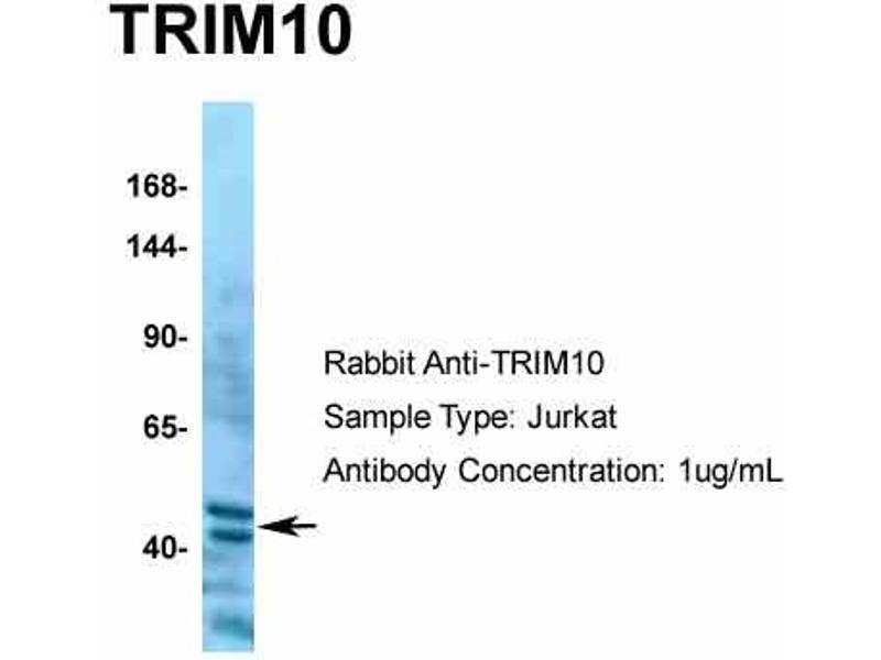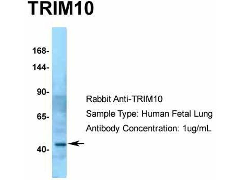 - This is a rabbit polyclonal antibody against TRIM10. It was validated on Western Blot using a cell lysate as a positive control.