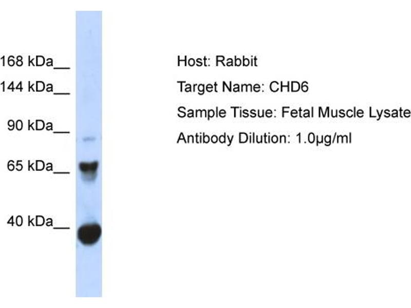This Rabbit Polyclonal antibody specifically detects CHD6 in WB. It exhibits reactivity toward Human, Mouse, Dog, Guinea Pig, Horse, Rabbit, Cow and Rat.