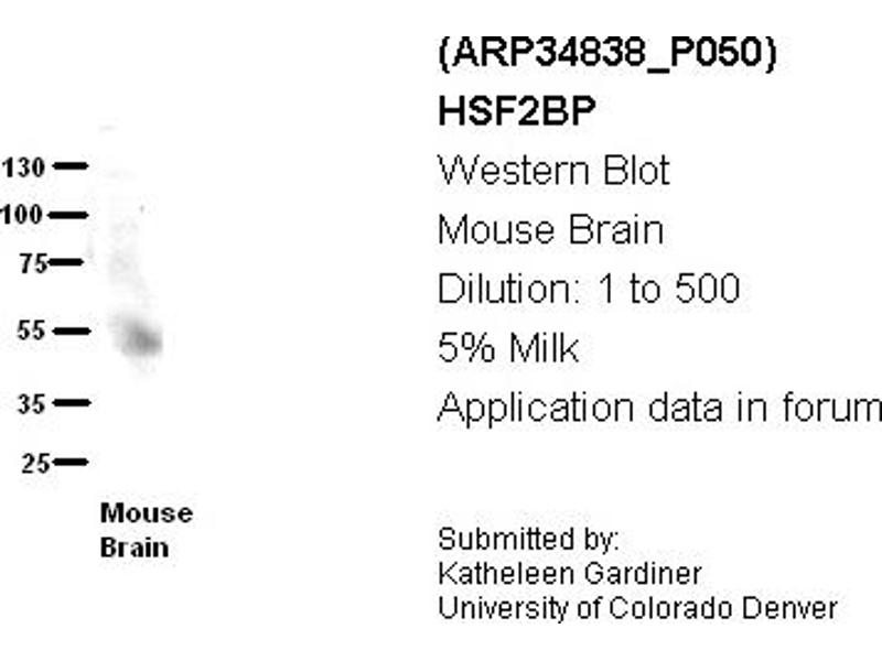 - The immunogen is a synthetic peptide directed towards the N terminal region of human HSF2BP