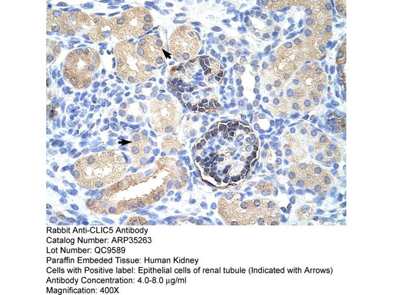 - The immunogen is a synthetic peptide directed towards the C terminal region of human CLIC5