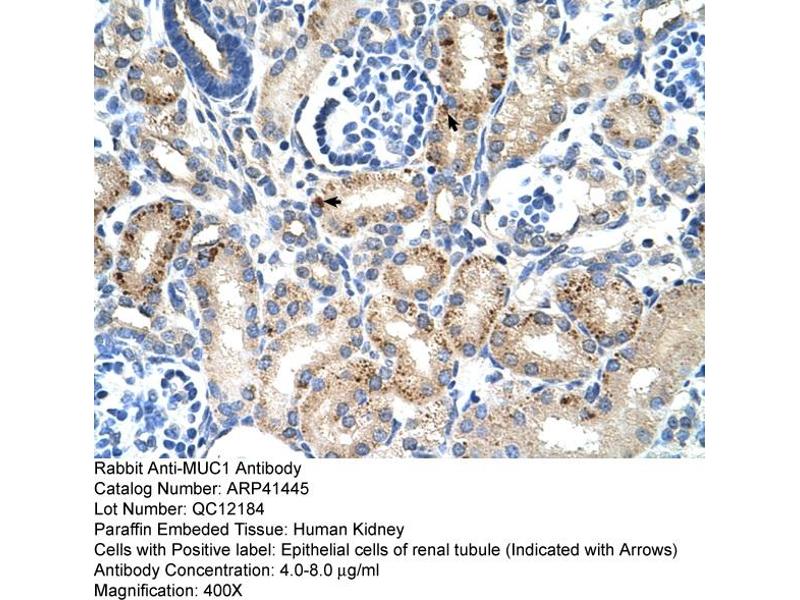 MUC1 is a membrane bound, glycosylated phosphoprotein. The protein is anchored to the apical surface of many epithelia by a transmembrane domain, with the degree of glycosylation varying with cell type. It also includes a 20 aa variable number tandem repeat (VNTR) domain, with the number of repeats varying from 20 to 120 in different individuals. The protein serves a protective function by binding to pathogens and also functions in a cell signaling capacity. Overexpression, aberrant intracellular localization, and changes in glycosylation of this protein have been associated with carcinomas.