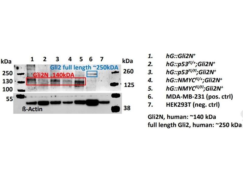 The predicted molecular weight of the full length GLI2 is 197kDa which is in accordance with our observation. With our previous anti-GLI2 antibody (sc-20291 (G-20), Santa Cruz Biotechnology) we also detected the GLI2ΔN protein at ~150kDa. The difference in apparent MW could be due to different migration of the marker.