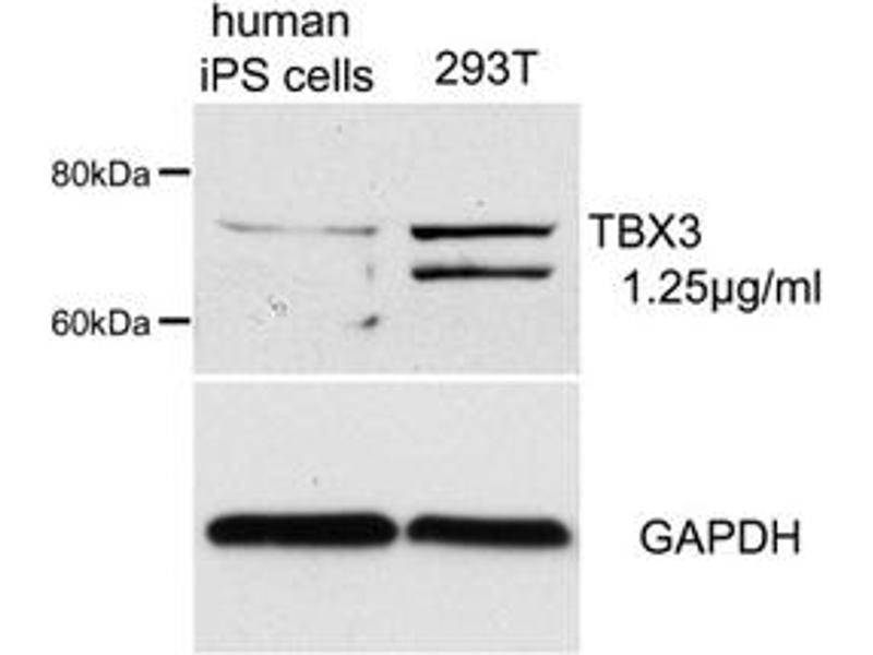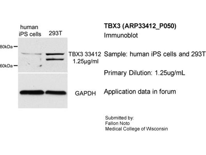 - This is a rabbit polyclonal antibody against TBX3. It was validated on Western Blot using a cell lysate as a positive control.