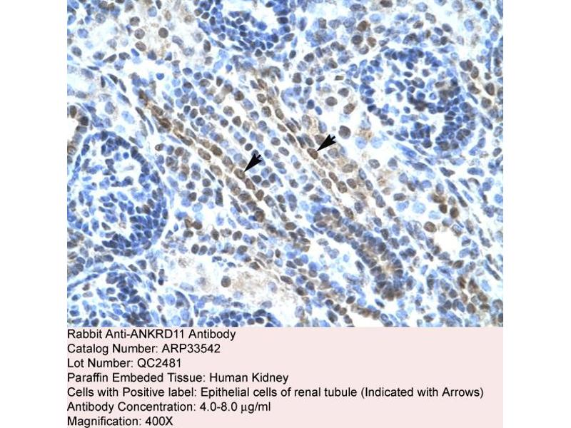 - This is a rabbit polyclonal antibody against ANKRD11. It was validated on Western Blot and immunohistochemistry.