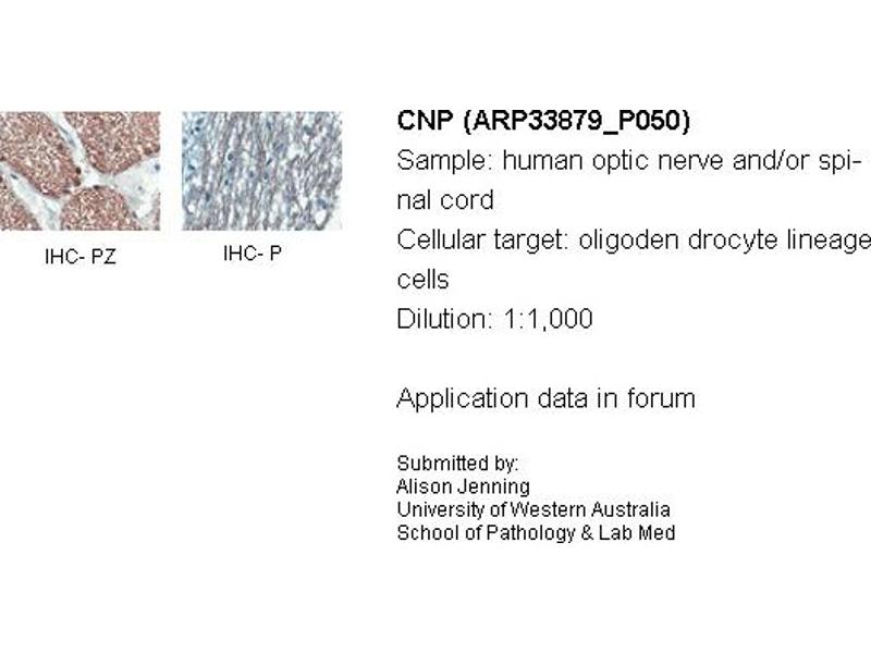 CNP belongs to the cyclic nucleotide phosphodiesterase family. It interacts with tubulin and promotes microtubule assembly for process outgrowth in oligodendrocytes. reduced CNP expression in the schizophrenic brain is relevant to disease etiology and therefore provide support for the general hypothesis that altered oligodendrocyte function is an etiological factor in schizophrenia.