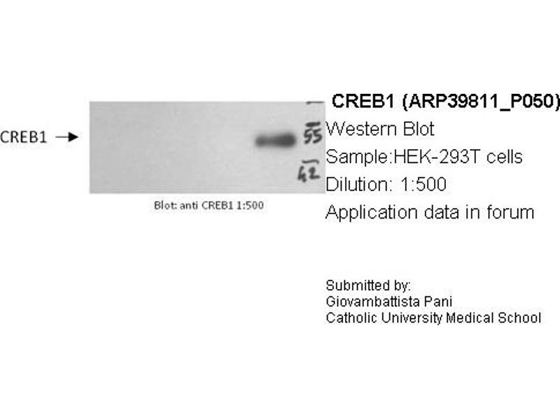 - This is a rabbit polyclonal antibody against CREB1. It was validated on Western Blot using a cell lysate as a positive control.