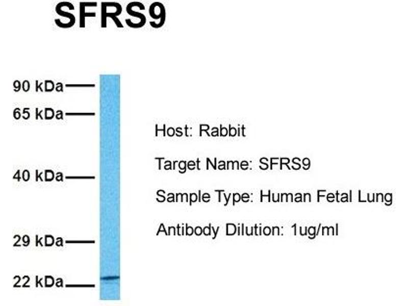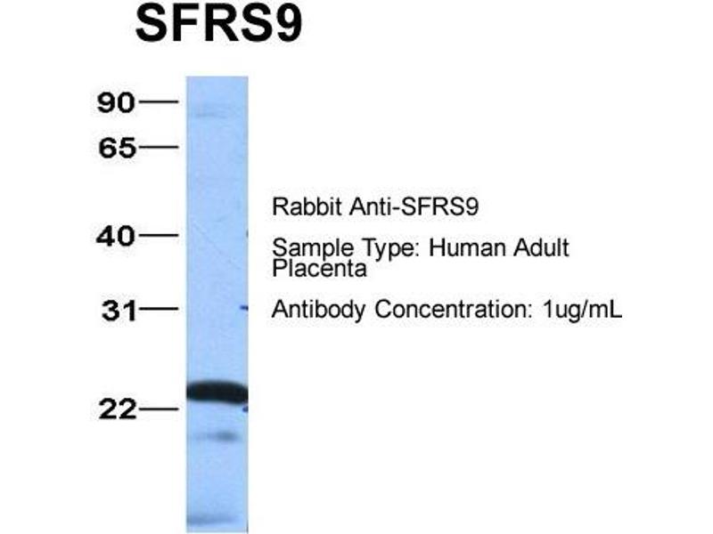 - This is a rabbit polyclonal antibody against SFRS9. It was validated on Western Blot using a cell lysate as a positive control.