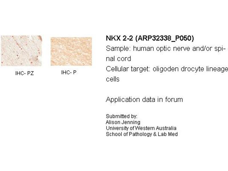 - The immunogen is a synthetic peptide directed towards the N terminal region of human NKX2-2