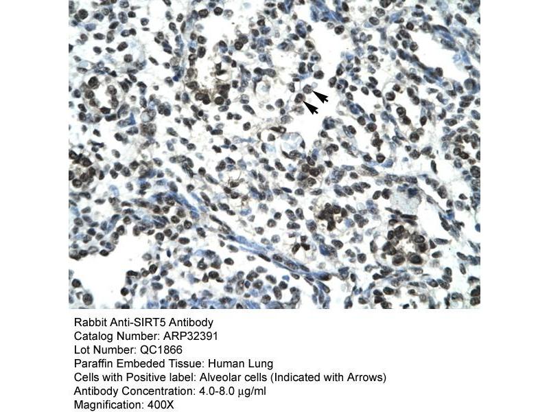 SIRT5 is a member of the sirtuin family of proteins, homologs to the yeast Sir2 protein. Members of the sirtuin family are characterized by a sirtuin core domain and grouped into four classes. The functions of human sirtuins have not yet been determined, however, yeast sirtuin proteins are known to regulate epigenetic gene silencing and suppress recombination of rDNA. Studies suggest that the human sirtuins may function as intracellular regulatory proteins with mono-ADP-ribosyltransferase activity. The protein encoded by this gene is included in class III of the sirtuin family.