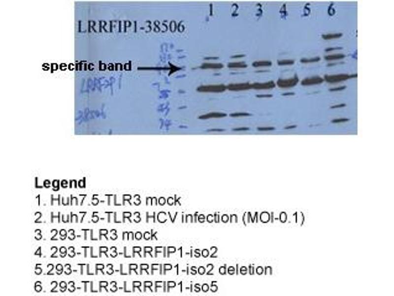 - This is a rabbit polyclonal antibody against LRRFIP1. It was validated on Western Blot using a cell lysate as a positive control.