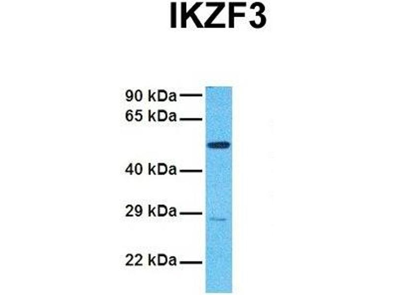 IKZF3 is a member of the Ikaros family of zinc-finger proteins. It is a transcription factor that is important in the regulation of B lymphocyte proliferation and differentiation. Both Ikaros and Aiolos can participate in chromatin remodeling. Regulation of gene expression in B lymphocytes by Aiolos is complex as it appears to require the sequential formation of Ikaros homodimers, Ikaros/Aiolos heterodimers, and Aiolos homodimers.This gene encodes a member of the Ikaros family of zinc-finger proteins. Three members of this protein family (Ikaros, Aiolos and Helios) are hematopoetic-specific transcription factors involved in the regulation of lymphocyte development. This gene product is a transcription factor that is important in the regulation of B lymphocyte proliferation and differentiation. Both Ikaros and Aiolos can participate in chromatin remodeling. Regulation of gene expression in B lymphocytes by Aiolos is complex as it appears to require the sequential formation of Ikaros homodimers, Ikaros/Aiolos heterodimers, and Aiolos homodimers. At least six alternative transcripts encoding different isoforms have been described.