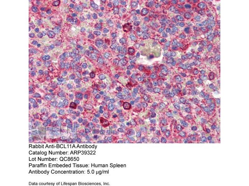 BCL11A Is a C2H2 type zinc-finger protein by its similarity to the mouse Bcl11a/Evi9 protein. The corresponding mouse gene is a common site of retroviral integration in myeloid leukemia, and may function as a leukemia disease gene, in part, through its interaction with BCL6. During hematopoietic cell differentiation, this gene is down-regulated. It is possibly involved in lymphoma pathogenesis since translocations associated with B-cell malignancies also deregulates its expression.This gene encodes a C2H2 type zinc-finger protein by its similarity to the mouse Bcl11a/Evi9 protein. The corresponding mouse gene is a common site of retroviral integration in myeloid leukemia, and may function as a leukemia disease gene, in part, through its interaction with BCL6. During hematopoietic cell differentiation, this gene is down-regulated. It is possibly involved in lymphoma pathogenesis since translocations associated with B-cell malignancies also deregulates its expression. Multiple transcript variants encoding several different isoforms have been found for this gene.