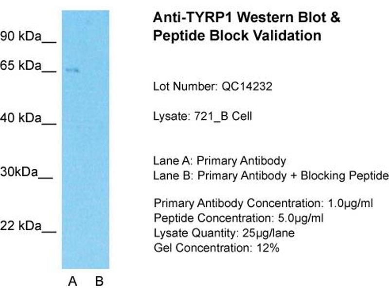 - This is a rabbit polyclonal antibody against TYRP1. It was validated on Western Blot using a cell lysate as a positive control.