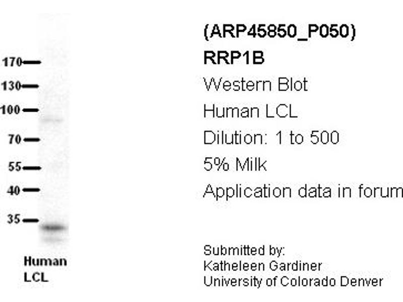 - The immunogen is a synthetic peptide directed towards the middle region of human RRP1B