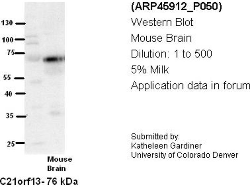 - The immunogen is a synthetic peptide directed towards the N terminal region of human C21orf13