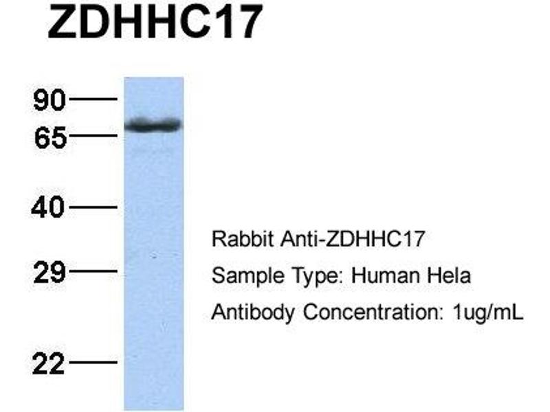 - This is a rabbit polyclonal antibody against ZDHHC17. It was validated on Western Blot using a cell lysate as a positive control.