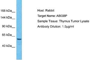 ABI3BP contains 2 fibronectin type-III domains. The loss of ABI3BP expression could play a functional role in thyroid tumorigenesis. It also presumably represents a trigger gene for evoking cellular senescence, which has also been suggested to be involved in the prevention of tumorigenesis. Alias Symbols: NESHBP, TARSH Protein Interaction Partner: UBC, CBX1, FZD5, MBNL1, GOT1, GRK5, MYC, GRB2, ABI3, Protein Size: 486