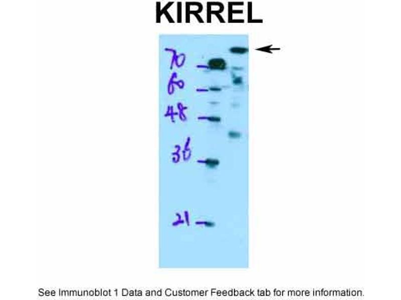 - This is a rabbit polyclonal antibody against KIRREL. It was validated on Western Blot using a cell lysate as a positive control.