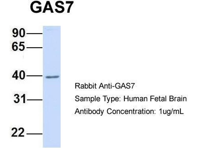 The growth arrest-specific 7 (GAS7) gene is expressed primarily in terminally differentiated brain cells and predominantly in mature cerebellar Purkinje neurons. GAS7 plays a putative role in neuronal development.Growth arrest-specific 7 is expressed primarily in terminally differentiated brain cells and predominantly in mature cerebellar Purkinje neurons. GAS7 plays a putative role in neuronal development. Several transcript variants encoding proteins which vary in the N-terminus have been described.
