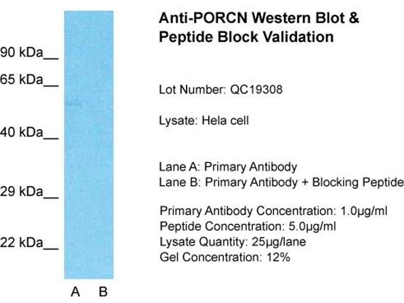 - This is a rabbit polyclonal antibody against PORCN. It was validated on Western Blot using a cell lysate as a positive control.