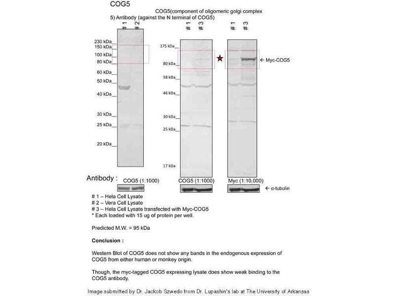 - This is a rabbit polyclonal antibody against COG5. It was validated on Western Blot using a cell lysate as a positive control.