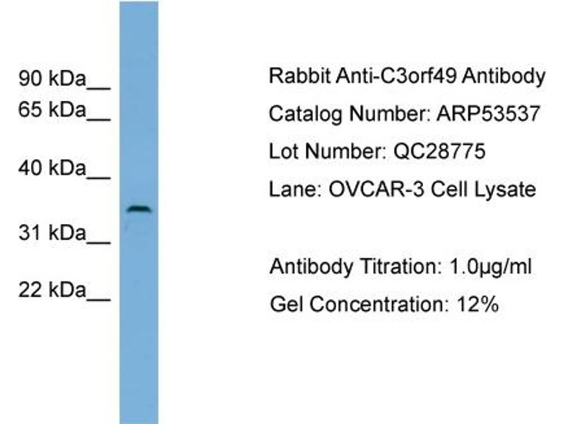 - This is a rabbit polyclonal antibody against C3orf49. It was validated on Western Blot using a cell lysate as a positive control.