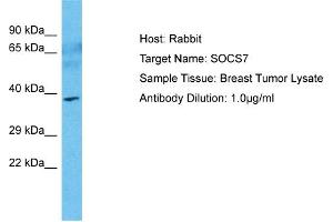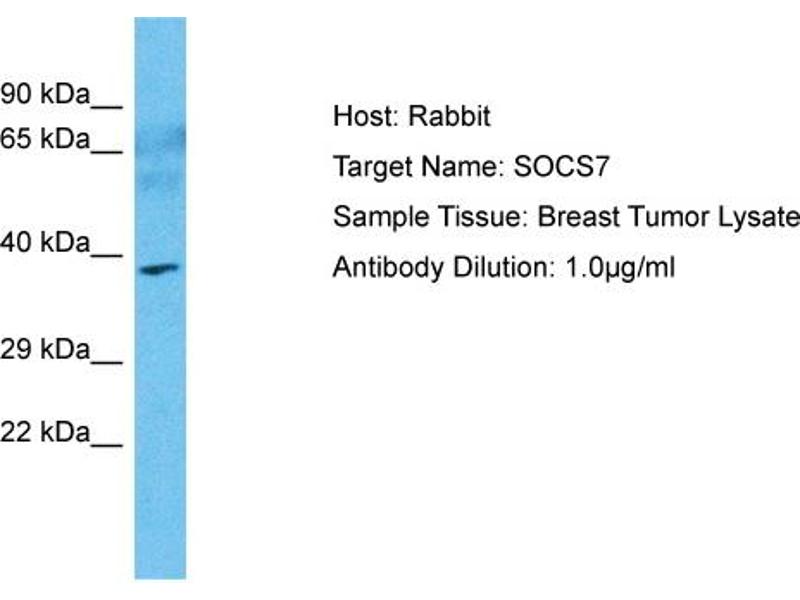 SOCS7 regulates signaling cascades probably through protein ubiquitination and/or sequestration. It functions in insulin signaling and glucose homeostasis through IRS1 ubiquitination and subsequent proteasomal degradation. It inhibits also prolactin, growth hormone and leptin signaling by preventing STAT3 and STAT5 activation, sequestering them in the cytoplasm and reducing their binding to DNA. SOCS7 may be a substrate recognition component of a SCF-like E3 ubiquitin-protein ligase complex which mediates the ubiquitination and subsequent proteasomal degradation of target proteins. Protein Interaction Partner: SEPT6, SORBS3, STAT5A, STAT3, CUL5, IRS4, PIK3R2, TUBB4B, TUBA1A, IRS2, NCK1, PLCG1, PIK3R1, EGFR, GRB2, Protein Size: 331