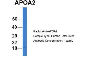 - This is a rabbit polyclonal antibody against APOA2. It was validated on Western Blot using a cell lysate as a positive control.