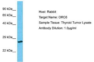 The origin recognition complex (ORC) is a highly conserved six subunit protein complex essential for the initiation of the DNA replication in eukaryotic cells. Studies in yeast demonstrated that ORC binds specifically to origins of replication and serves as a platform for the assembly of additional initiation factors such as Cdc6 and Mcm proteins. ORC6L is a subunit of the ORC complex. It has been shown that this protein and and ORC1L are loosely associated with the core complex consisting of ORC2L, -3L, -4L and -5L. Gene silencing studies with small interfering RNA demonstrated that this protein plays an essential role in coordinating chromosome replication and segregation with cytokinesis. Alias Symbols: ORC6L Protein Interaction Partner: LHX4, SPAG5, UBC, ORC3, CDC7, ORC4, MCM7, MCM6, MCM4, MCM2, CDC6, APP, ORC2, SUMO2, XRCC5, XRCC6, HMGA1, MCM5, TERF2, ORC5, DBF4, CDC45, RPA1, Protein Size: 252