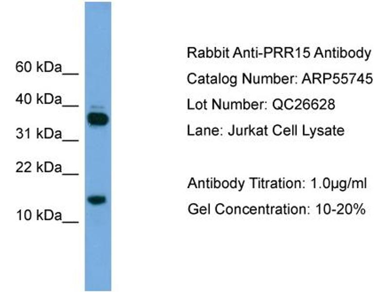 - This is a rabbit polyclonal antibody against PRR15. It was validated on Western Blot using a cell lysate as a positive control.