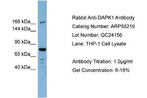- This is a rabbit polyclonal antibody against DAPK1. It was validated on Western Blot using a cell lysate as a positive control.