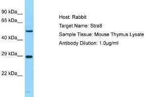 This is a rabbit polyclonal antibody against Stra8. It was validated on Western Blot.