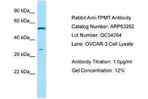 This is a rabbit polyclonal antibody against TPMT. It was validated on Western Blot.