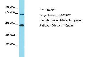 This is a rabbit polyclonal antibody against KIAA2013. It was validated on Western Blot.