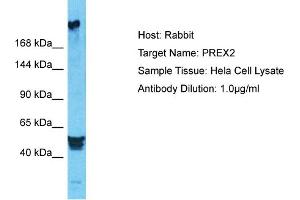 PREX2 functions as a RAC1 guanine nucleotide exchange factor (GEF), activating Rac proteins by exchanging bound GDP for free GTP. Its activity is synergistically activated by phosphatidylinositol 3,4,5-trisphosphate and the beta gamma subunits of heterotrimeric G protein. PREX2 mediates the activation of RAC1 in a PI3K-dependent manner. PREX2 may be an important mediator of Rac signaling, acting directly downstream of both G protein-coupled receptors and phosphoinositide 3-kinase. Protein Interaction Partner: PPP1CA, MTOR, TGFBR1, Protein Size: 1606