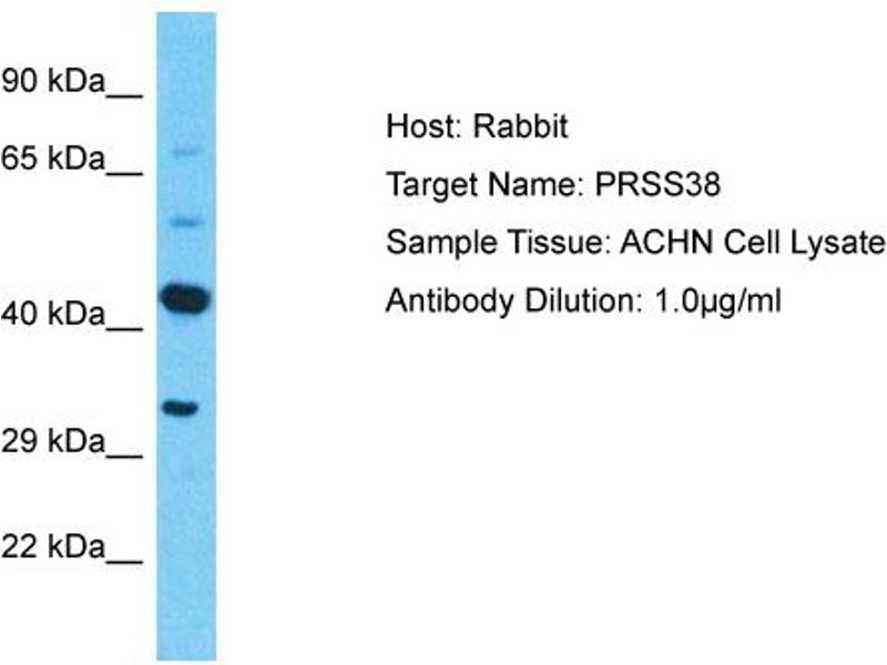 This anti-PRSS38 antibody is a Rabbit Polyclonal antibody detecting PRSS38 in WB. Suitable for Human.