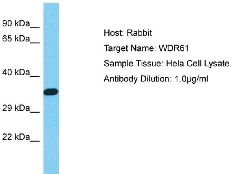 This anti-WDR61 antibody is a Rabbit Polyclonal antibody detecting WDR61 in WB. Suitable for Human, Rat, Mouse, Horse, Cow, Dog, Guinea Pig and Rabbit.