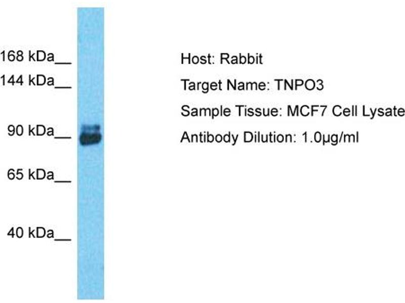 The protein encoded by this gene is a nuclear import receptor for serine/arginine-rich (SR) proteins such as the splicing factors SFRS1 and SFRS2. The encoded protein has also been shown to be involved in HIV-1 infection, apparently through interaction with the HIV-1 capsid protein. Two transcript variants encoding different isoforms as well as a noncoding transcript have been found for this gene. Protein Interaction Partner: UBC, SUMO1, NEDD8, ELAC2, IPO9, TTLL12, PFDN6, ARPC2, ACTR3, PPP3CA, PPP2R1A, PPP2CA, HNRNPH1, FEN1, ALDOA, CLK3, CLK2, EGFR, SOX2, SMURF2, CFTR, VCP, CA9, UBE3A, TNPO1, CHMP3, ELAVL1, USP19, TRA2B, SRSF1, C20orf24, BRF2, PHLDA3, Protein Size: 859