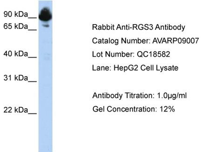 - This is a rabbit polyclonal antibody against RGS3. It was validated on Western Blot using a cell lysate as a positive control.