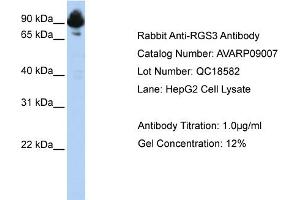 - This is a rabbit polyclonal antibody against RGS3. It was validated on Western Blot using a cell lysate as a positive control.