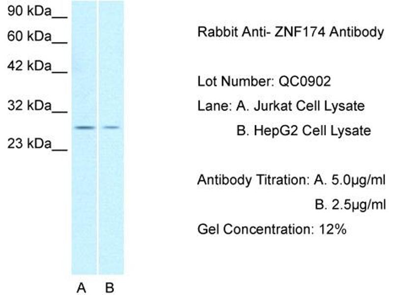 This is a rabbit polyclonal antibody against ZNF174. It was validated on Western Blot using a cell lysate as a positive control.